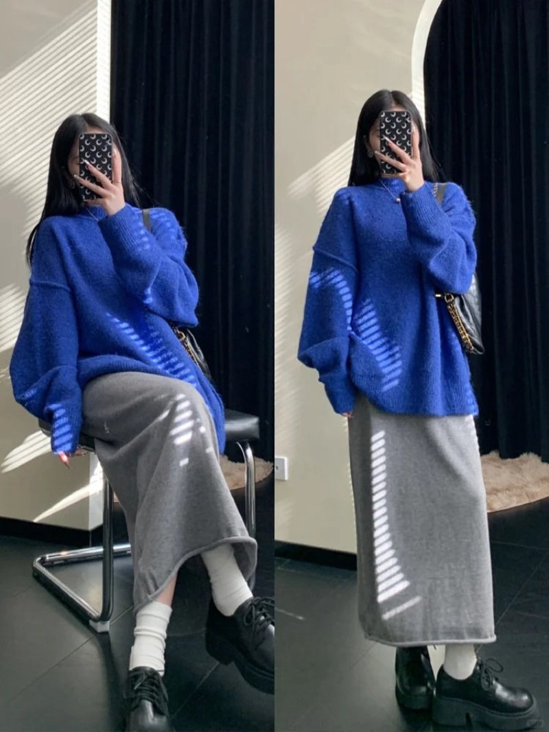 Áo len oversize và chân váy dài lưng cao