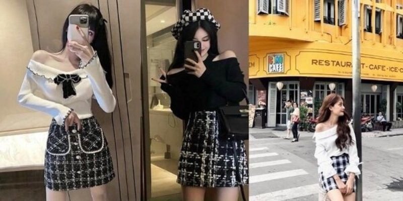 Áo len trễ vai phối cùng chân váy dạ tweed mang lại vẻ quyến rũ nhưng vẫn thanh lịch. Set đồ này rất phù hợp cho các buổi gặp gỡ cuối năm hoặc những dịp tiệc nhẹ. Bạn có thể chọn boots cổ thấp hoặc giày bệt để cân đối tổng thể trang phục. Kiểu phối này giúp bạn vừa nữ tính vừa hiện đại, tạo sự nổi bật mà không quá phô trương.