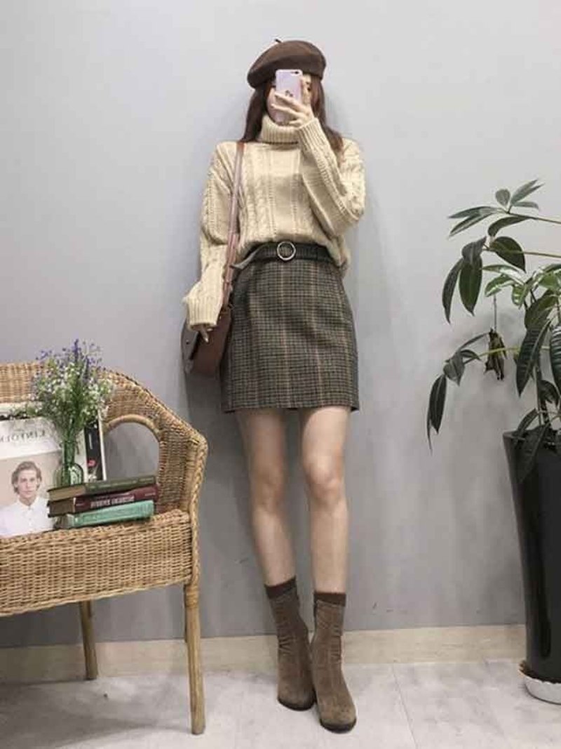 Chân váy chữ A phối cùng áo len tạo nên phong cách nữ tính, nhẹ nhàng và thanh lịch. Bạn có thể chọn áo len cổ tròn hoặc cổ V, kết hợp mũ beret để tăng vẻ đáng yêu. Kiểu phối này phù hợp cho cả đi chơi, dạo phố lẫn các dịp gặp gỡ bạn bè. Sự kết hợp giữa áo len và chân váy chữ A mang lại set đồ dễ áp dụng, trẻ trung và không kén dáng người.