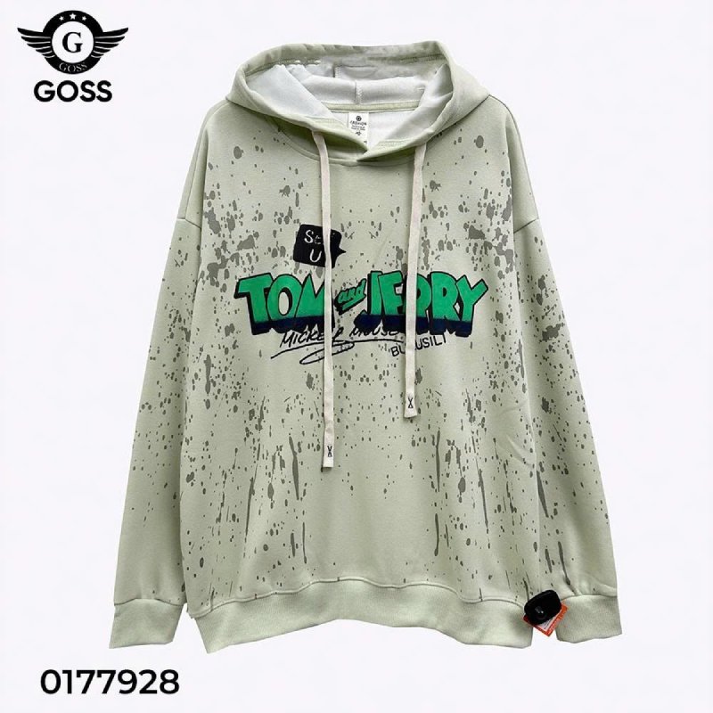 Hoodie GOSS 0177928 nổi bật với họa tiết Tom and Jerry kết hợp hiệu ứng loang sơn, mang lại cảm giác cá tính nhưng vẫn gần gũi. Gam màu xanh nhạt theo hơi hướng vintage giúp áo dễ mặc và không lỗi mốt. Chất liệu nỉ cotton pha cao cấp, mềm mịn, giữ ấm tốt và thoáng khí. Form oversize rộng rãi giúp người mặc thoải mái, phù hợp xu hướng hiện nay và che khuyết điểm dáng người. Mũ liền thân, bo tay và bo gấu được may kỹ, giúp áo giữ form ổn định khi sử dụng lâu dài.