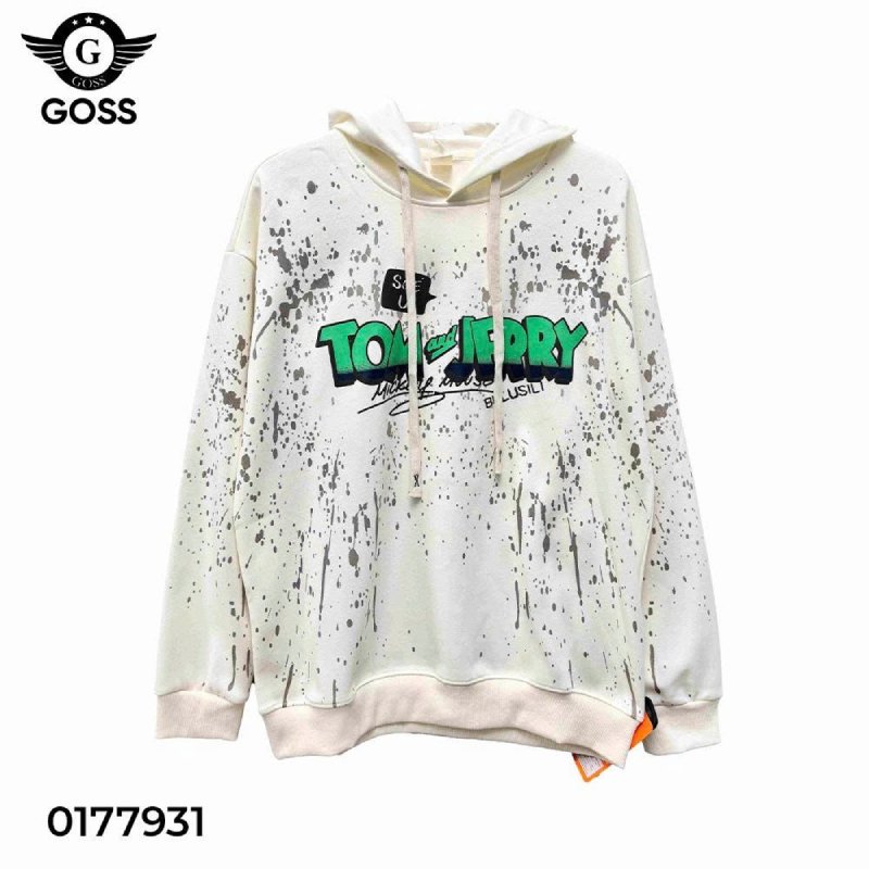 Áo hoodie GOSS 0177931 sở hữu thiết kế Tom and Jerry in lớn trên nền trắng kem, kết hợp hiệu ứng vẩy sơn tạo điểm nhấn rõ ràng. Tông màu trung tính giúp áo dễ phối với nhiều phong cách khác nhau. Chất liệu nỉ cotton pha dày vừa, mềm và ít xù lông, mang lại cảm giác ấm áp khi mặc. Form oversize rộng rãi, phù hợp người thích phong cách streetwear thoải mái. Mũ trùm liền thân, dây rút chắc chắn cùng bo tay gọn gàng giúp áo vừa tiện dụng vừa giữ được form dáng lâu dài.