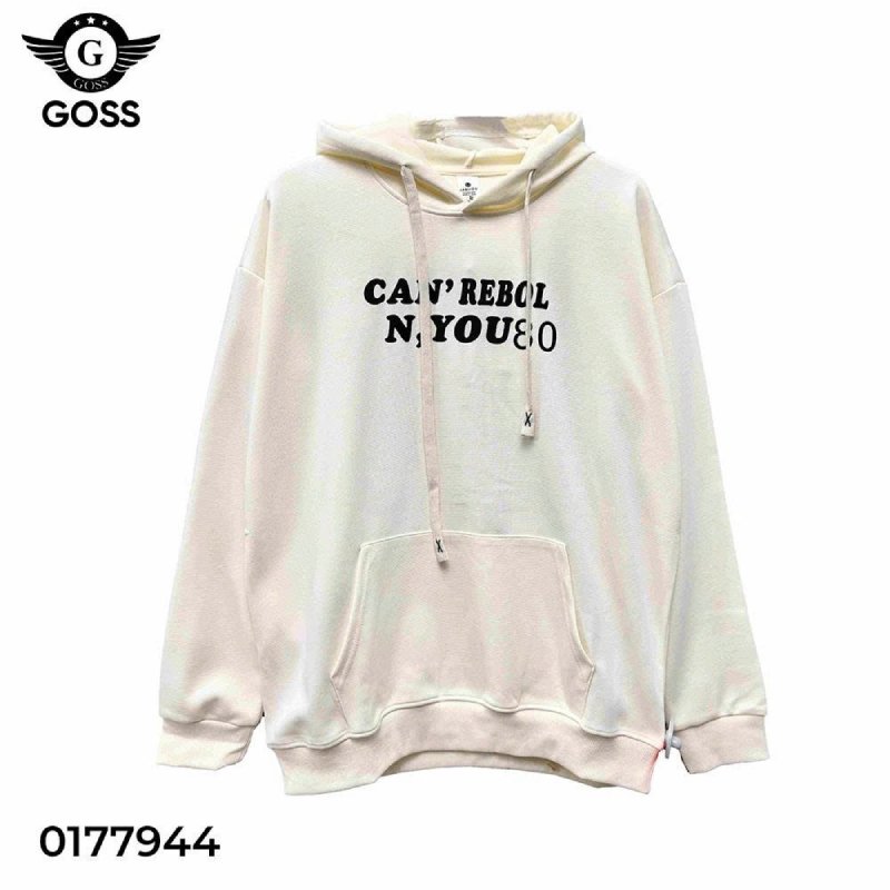 Hoodie GOSS 0177944 hướng đến phong cách tối giản với gam màu trắng ngà nhẹ nhàng. Điểm nhấn là dòng chữ in gọn gàng trước ngực, phù hợp xu hướng streetwear đơn giản. Chất liệu nỉ cotton pha cao cấp, mềm mịn, giữ ấm tốt và thoáng khí. Form áo rộng rãi, dễ mặc và phù hợp nhiều dáng người. Mũ liền thân, túi trước rộng và bo tay chắc chắn giúp áo gọn gàng, tiện lợi khi sử dụng hằng ngày.