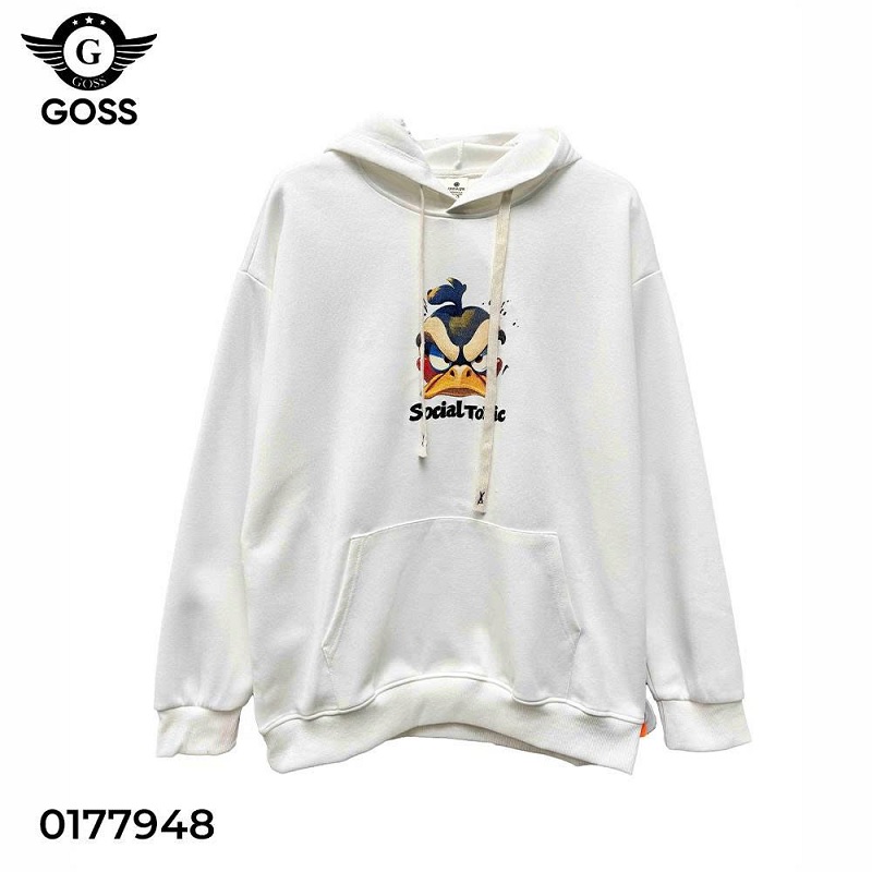 Hoodie GOSS 0177948 gây ấn tượng với hình in nhân vật hoạt hình cá tính kết hợp chữ in độc đáo trên nền trắng tinh tế. Thiết kế trẻ trung, phù hợp giới trẻ yêu thích phong cách streetwear. Chất liệu nỉ cotton pha mềm mại, dày vừa, giữ ấm tốt và ít xù lông. Form áo rộng rãi giúp che khuyết điểm và tạo cảm giác thoải mái. Mũ liền thân, dây rút chắc chắn cùng bo tay gọn gàng giúp áo bền và dễ mặc trong nhiều hoàn cảnh.